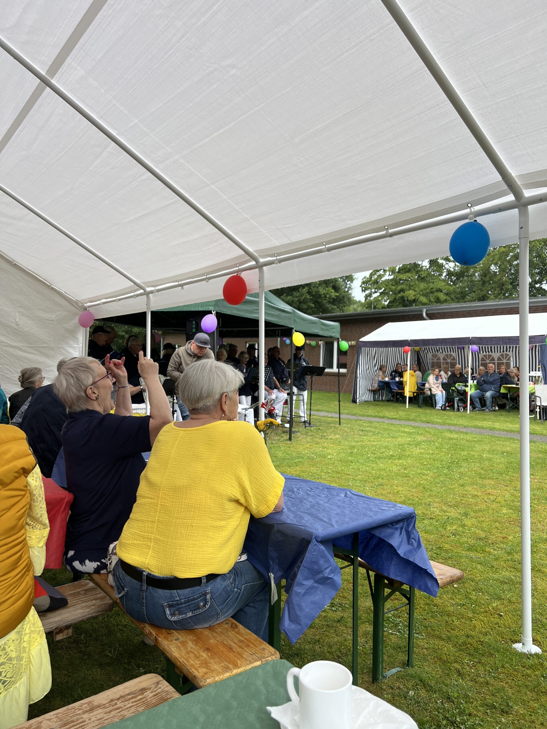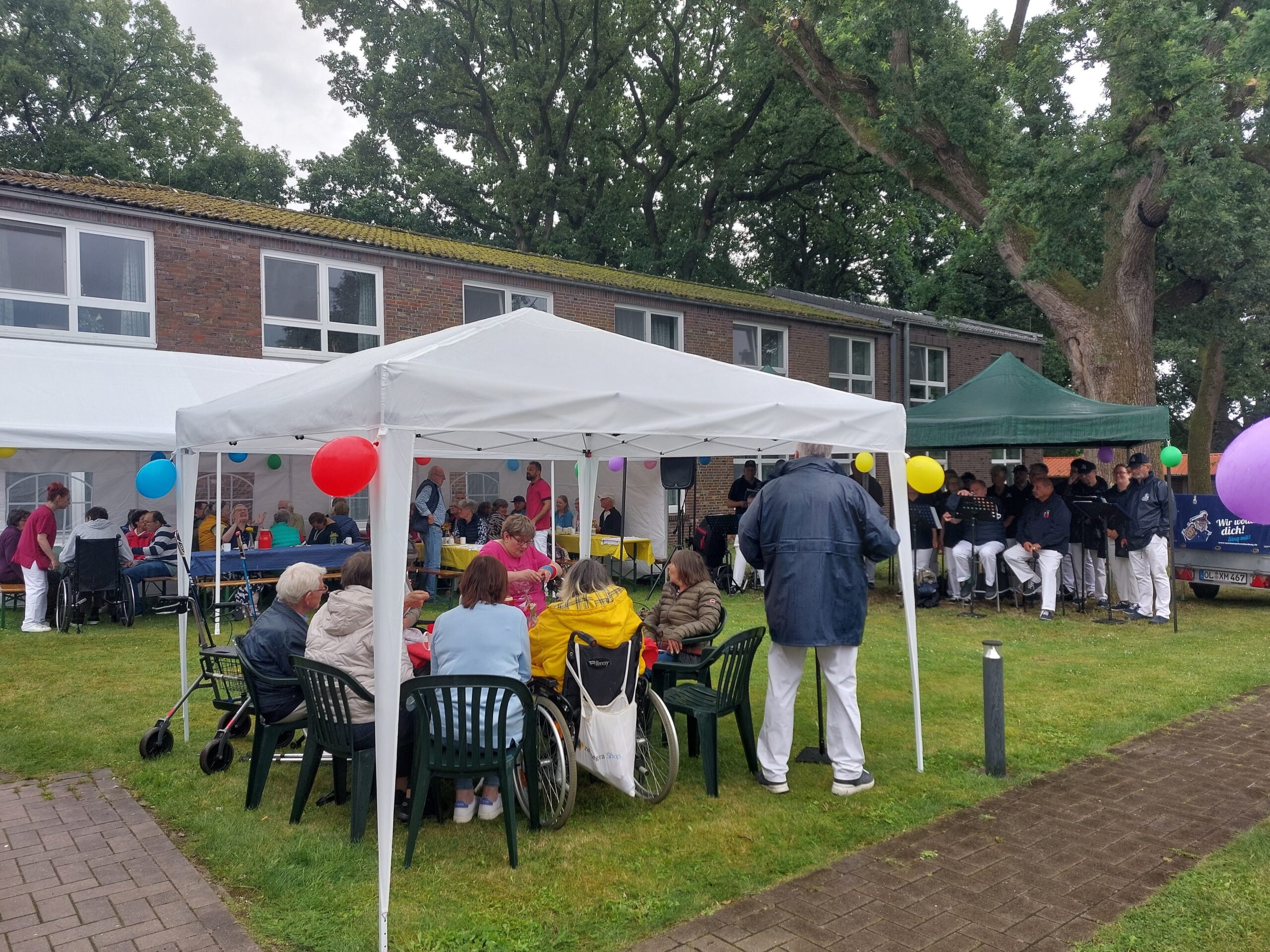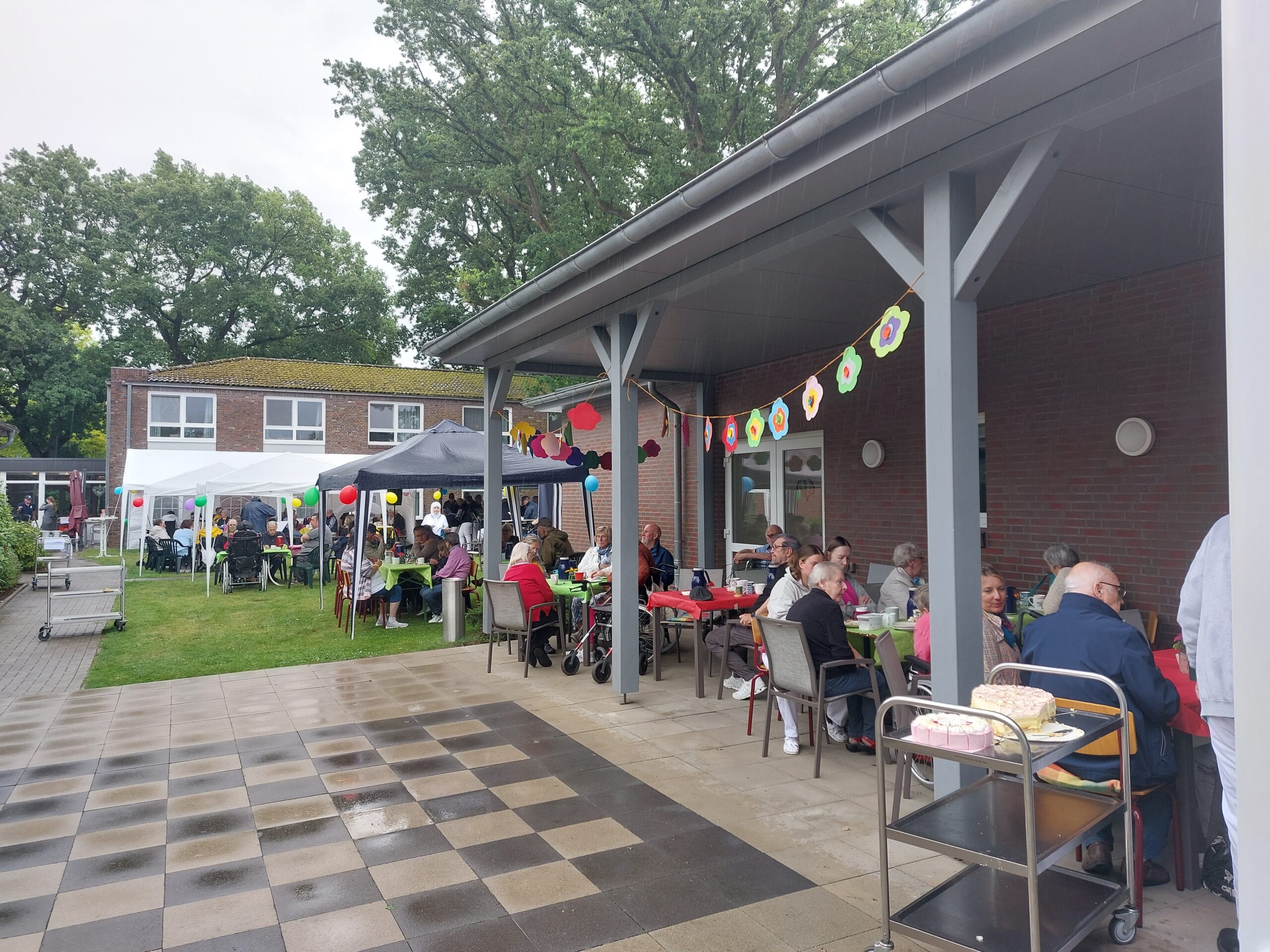 Oldenburg, im Juli 2025. Bestellt hatte das Pflegeheim Bloherfelde strahlenden Sonnenschein und milde Temperaturen, stattdessen bekamen Gäste, Bewohnende und Mitarbeitende pünktlich zu Beginn des großen Sommerfests Regen in allen Variationen. Dennoch lies sich niemand von dem Wetter abschrecken. Die aufgestellten Pavillons boten den entsprechenden Schutz. Ganz Pfiffige hatten sich einen Platz im hinteren Flurbereich des Pflegeheims und somit im Trockenen gesichert und genossen den Blick auf das bunte Treiben.