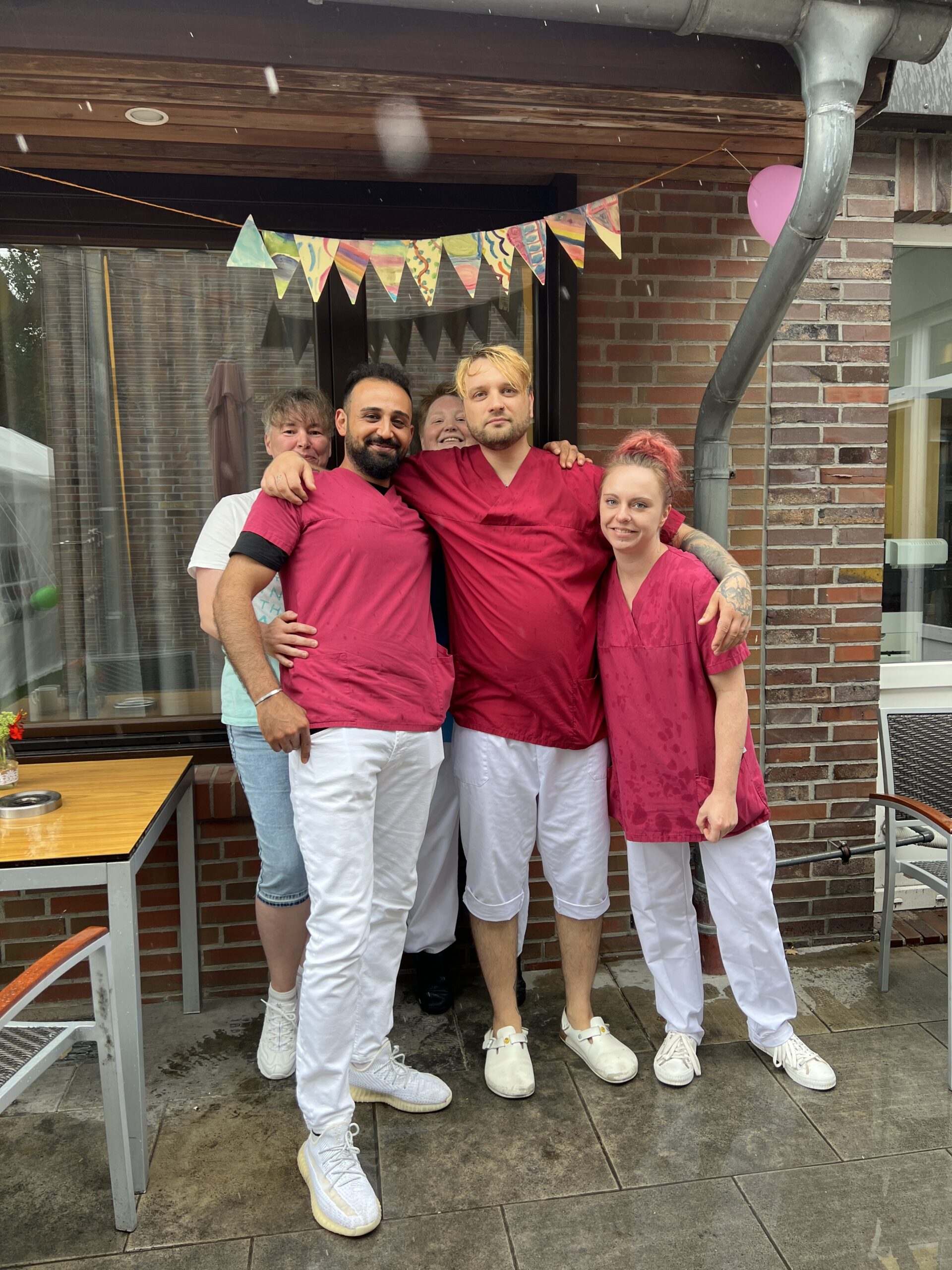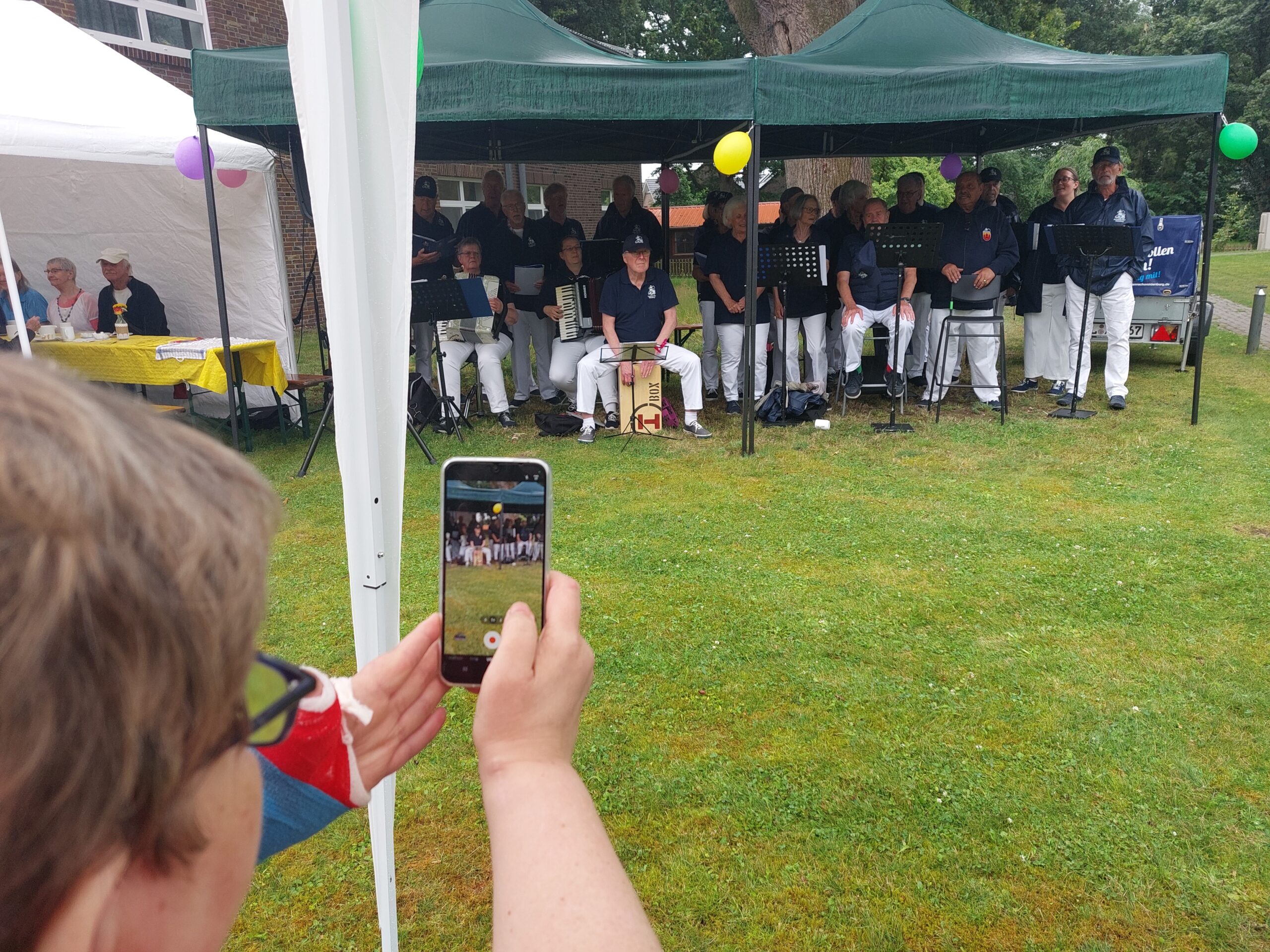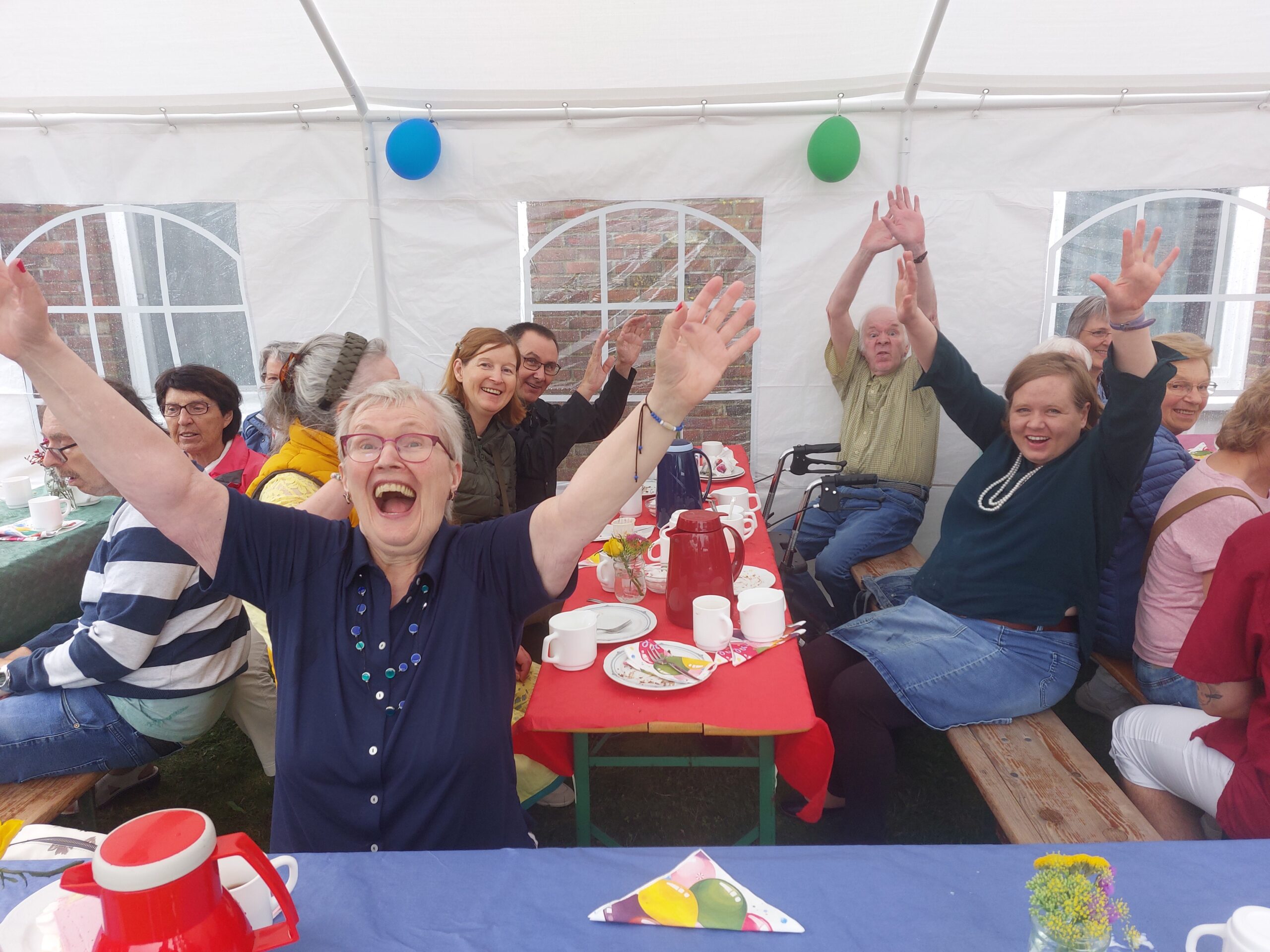 Oldenburg, im Juli 2025. Bestellt hatte das Pflegeheim Bloherfelde strahlenden Sonnenschein und milde Temperaturen, stattdessen bekamen Gäste, Bewohnende und Mitarbeitende pünktlich zu Beginn des großen Sommerfests Regen in allen Variationen. Dennoch lies sich niemand von dem Wetter abschrecken. Die aufgestellten Pavillons boten den entsprechenden Schutz. Ganz Pfiffige hatten sich einen Platz im hinteren Flurbereich des Pflegeheims und somit im Trockenen gesichert und genossen den Blick auf das bunte Treiben.