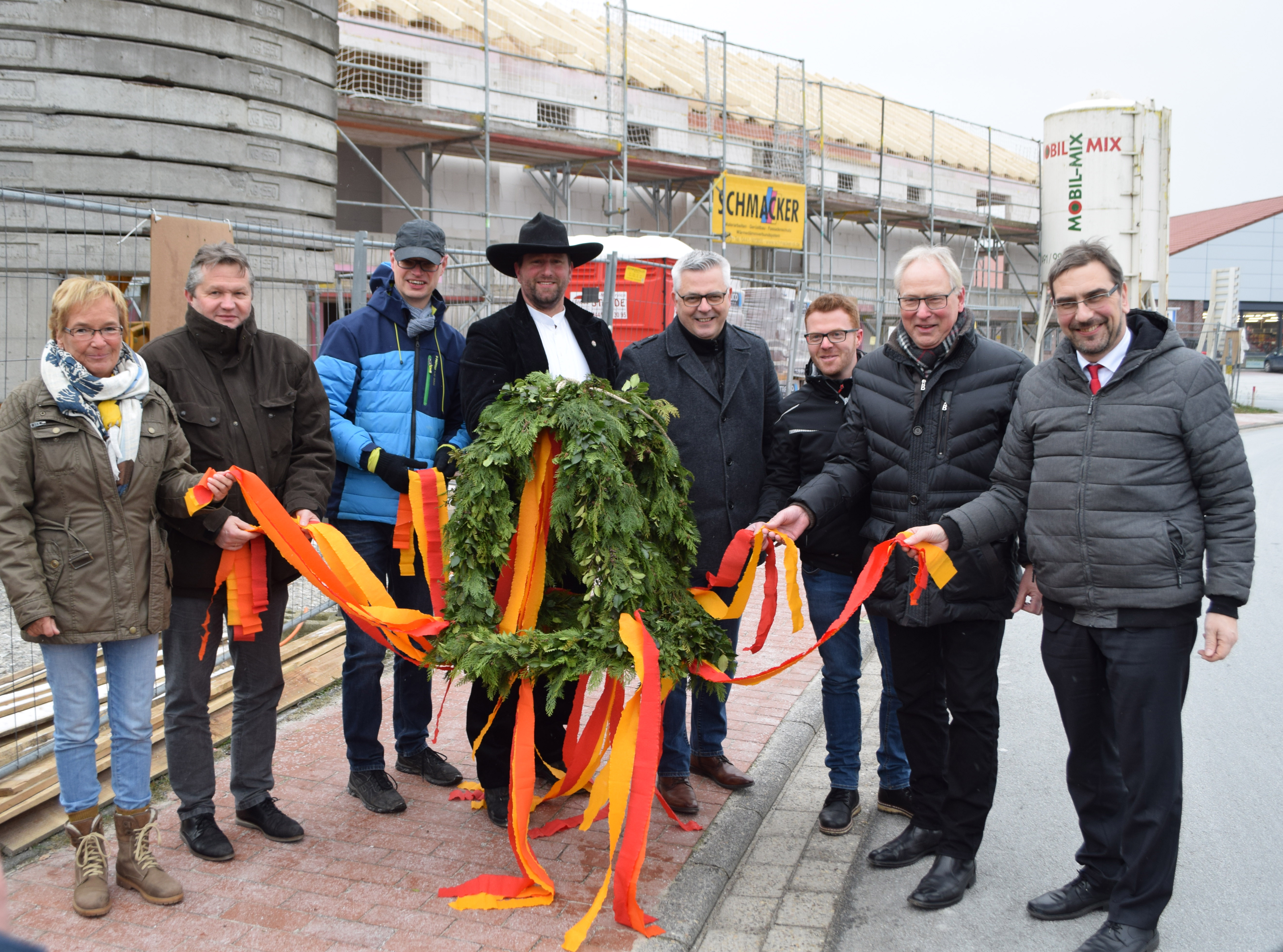 Sande. Frieslands Landrat Sven Ambrosy (Vorsitzender des Bezirksverbandes Oldenburg, BVO), Frank Diekhoff (Geschäftsführer des BVO) und Bettina Werner (Einrichtungsleiterin des Wohnheims Sande) feierten heute mit den Bewohnern, den Handwerkern und Gästen das Richtfest für den Neubau der Außenwohngruppe.